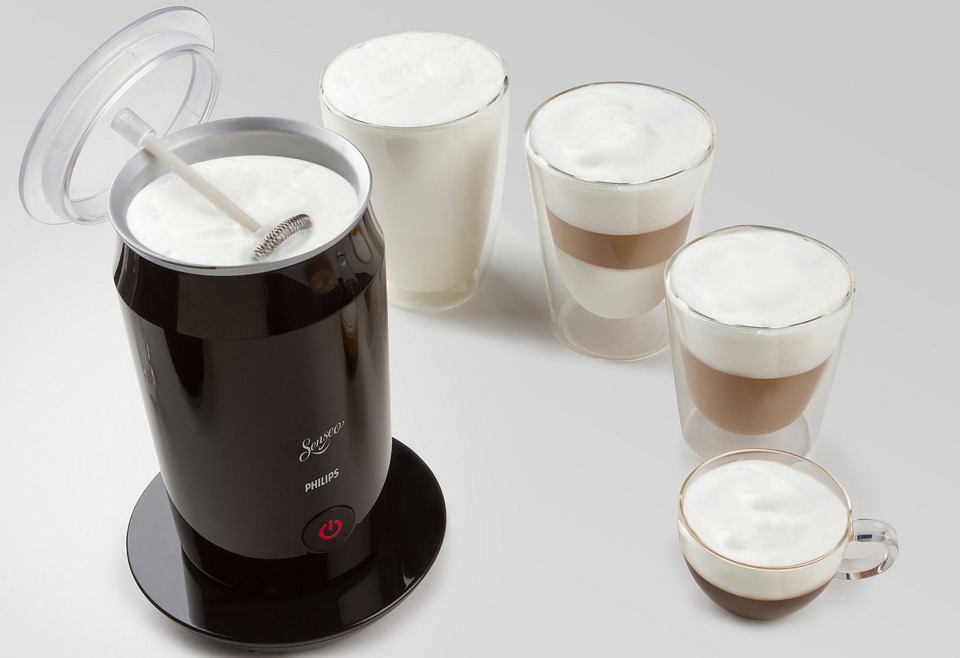 Top-Feature: Ihre Tasse Kaffee wird noch interessanter: Der SENSEO® Milchaufschäumer bietet Ihnen die Freiheit, eine Vielzahl verschiedener heißer und kalter Kaffeespezialitäten zu Hause zu genießen. Dank des innovativen Aufschäumers können Sie köstliche Kaffeespezialitäten mit erstaunlich samtigem, glattem Milchschaum bereichern. Weitere Vorteile: Magnetisches Aufschäumen: Wenn der SENSEO® Milchaufschäumer und sein innovativer Aufschäumaufsatz auf die ideale Temperatur und Geschwindigkeit eingestellt sind, können Sie perfekt geschlagenen, weichen Milchschaum genießen. Für Rezepte mit Heiß Für Rezepte mit Heiß- und Kaltgetränken: Mit dem Milchaufschäumer haben Sie die Freiheit, eine Vielzahl an heißen und kalten Kaffeerezepten zu Hause zubereiten und genießen zu können, wie etwa Latte Macchiato, Cappuccino oder den perfekten Eiskaffee Leicht zu reinigen: Dank der Antihaftbeschichtung und der glatten Oberfläche genügt ein einfaches Abspülen und Abtrocknen. Das wasserdichte Gehäuse ermöglicht ein bequemes Abwas