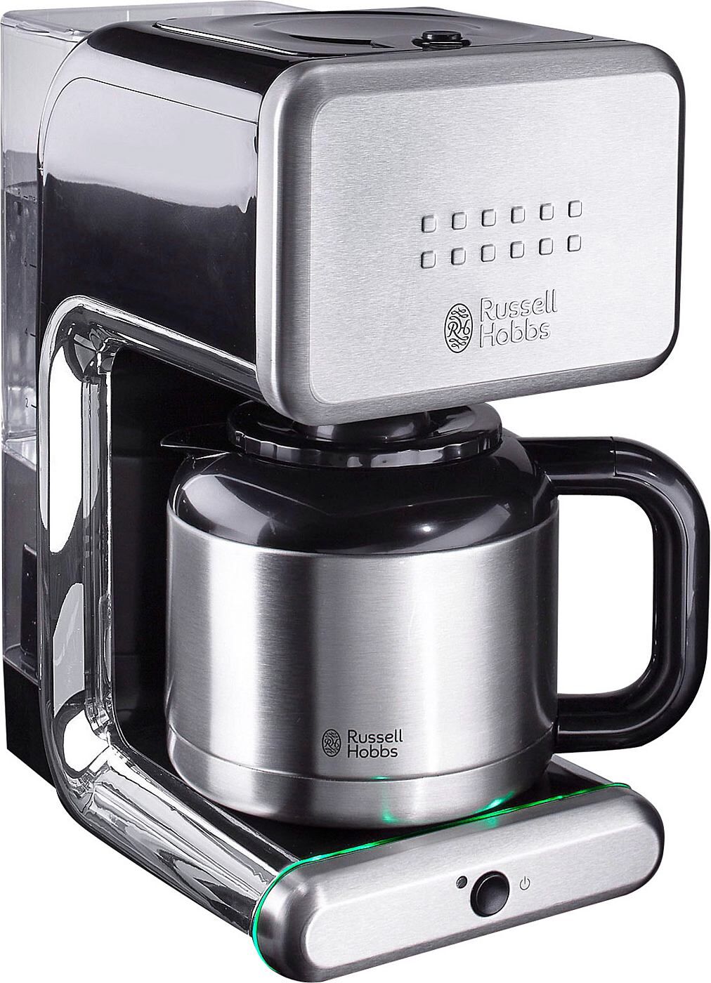 Mit der Serie Illumina von Russell Hobbs wird das Frühstück farbenfroh: Der speziell entwickelte 4-farbige Illumina Leuchtring zeigt den Geschmackszustand des Kaffees an. Die Oberfläche ist aus gebürstetem Edelstahl mit Kunststoffapplikationen und markanter Russell Hobbs Prägung. Top-Feature: Die 8 Tassen fassende Illumina Thermo- Kaffeemaschine verfügt über alle notwendigen Ausstattungsmerkmale, wie einem abnehmbaren Wassertank, Tropf-Stopp und einer Abschaltautomatik. Für einen perfekten Kaffeegenuss sorgen eine neue Brausekopftechnologie sowie ein Schnellheizsystem Weitere Vorteile: 4-farbiger Illumina Leuchtring – spiegelt optisch den Geschmackszustand des Kaffees wider Brausekopf-Technologie Bessere Kaffee-Extraktion für ein hervorragendes Aroma Schnellheizsystem – erreicht 65% schneller die optimale Brühtemperatur Brühtemperatur 98°C, Hochwertige Thermokanne, Automatische Abschaltung (1 Stunde nach dem letzten Brühvorgang,Wasserstandsanzeige mit Füllmengenmarkierung,Kontrollleuchte,8 Tassen Fassungsve